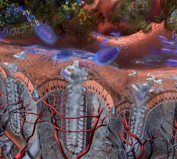 This panel focuses on the bacteria H. Pylori moving into the mucous layer on the epithelial cell lining damaging those cells.