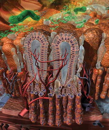 Detail from this panel focusing on the bacteria H. Pylori moving into the mucous layer on the epithelial cell lining damaging those cells.