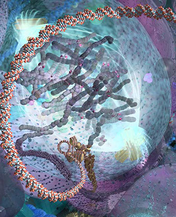 Scale makes the viewer part of the complex molecular machinery human cell focusing on areas of interest to the biotechnology industry, such as the human genome, DNA, mRNA, proteins, enzymes, receptors, antibodies, etc.