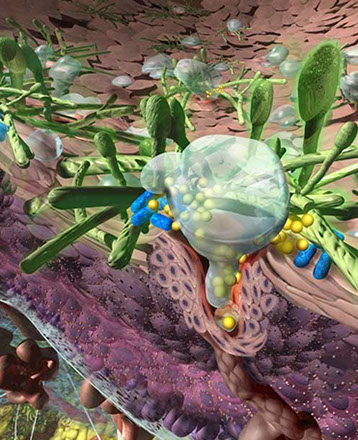 This panel focuses on the bacteria H. Pylori moving into the mucous layer on the epithelial cell lining damaging those cells. Series "THEM" done for a Discovery Center museum exhibit. and chosen in the Institutional Category for the Communication Arts 51st Illustration Annual.