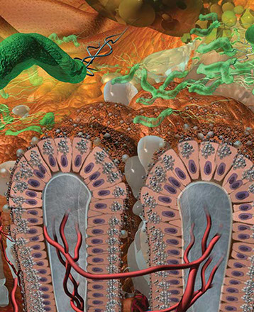 Detail from this panel focusing on the bacteria H. Pylori moving into the mucous layer on the epithelial cell lining damaging those cells.